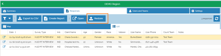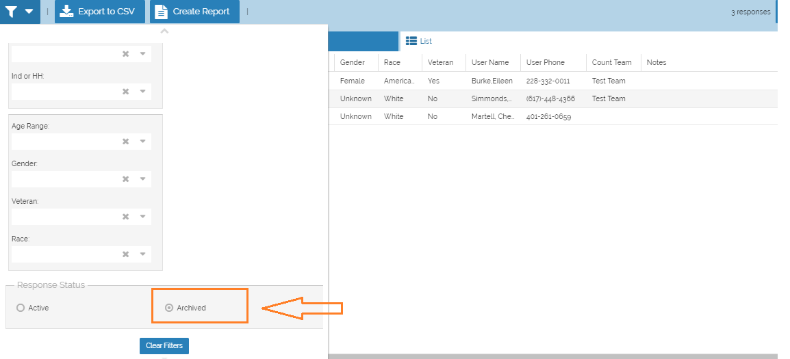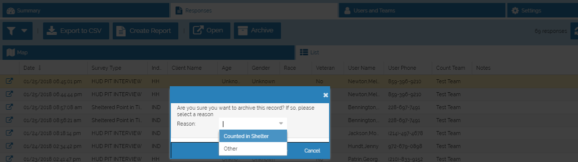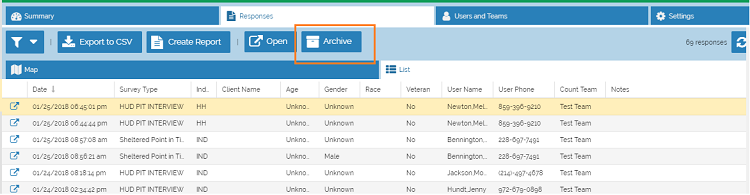 Sometimes a survey is submitted that shouldn't have been. Perhaps the person was already counted, or they are being transported to shelter and will be picked up in the HMIS data for the night of the Count. Whatever the reason to exclude a survey, it can be archived. Similarly, if a survey was mistakenly archived, it can be unarchived. If a survey is archived, it is no longer visible in the Command Center and any reports.