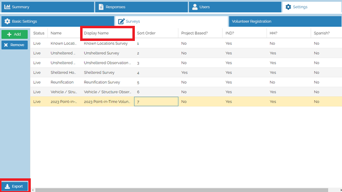 Surveys can be added to Activities by navigating to the Surveys tab under Settings within an activity by clicking Add and selecting the desired survey from the dropdown list. Display Name can be altered here as well. Project Based relates to whether a survey will connect with the projects (shelters, day centers, etc.) entered into the Command Center by your team. IND (individual) and HH (household) denote if a survey is capable of being interconnected amongst multiple entries.