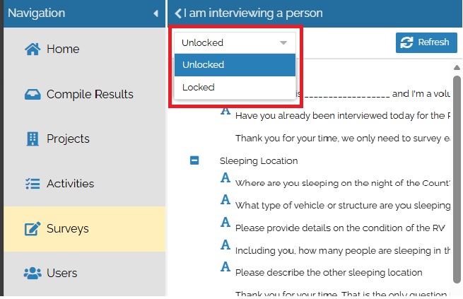 Once inside Surveys, select the survey you wish to update. Make sure to select Unlocked before attempting to make any changes. When you are finished making changes, change it to Locked to ensure that no accidental or unintentional alterations are made.