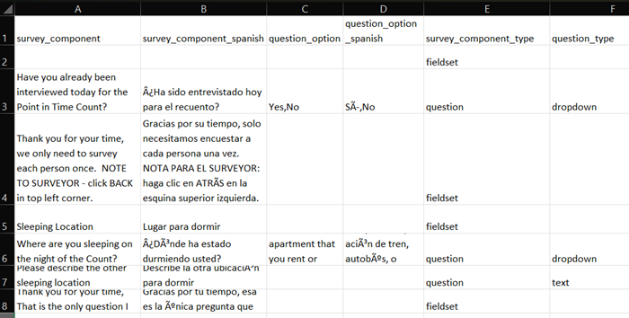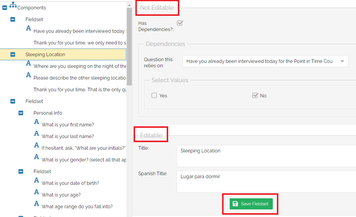 Both Questions and Fieldsets may be edited. Fieldsets are treated as headers to sections within surveys and can be used for titles as well as additional instructions or text for surveyors. After selecting an option, a pop-up will show what can be edited and what cannot. The Not Editable section is integral to how the survey functions within the system, while the Editable section is used for display and translation purposes. Make sure to click SAVE before navigating away from your edits to make sure your progress is not lost. Click Refresh at the top of the survey to show new changes immediately.