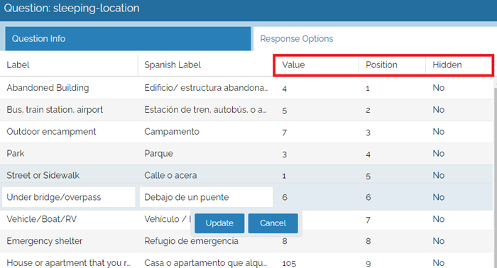 For questions with multiple responses (Checkbox, Dropdown, Radio, etc.), Response Options can have display labels changed both for English and Spanish translations. Currently, no other languages are available at this time. Value, Position, and Hidden are pieces related to how the data is collected within the system. If you would like to have a response value added or hidden, please contact the Simtech team.