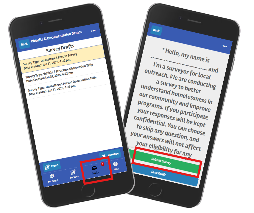 If you have saved a completed survey that is ready for submission, and are in an area with a connection to the Internet, tap the “Drafts” icon at the bottom of the app to view your saved drafts.