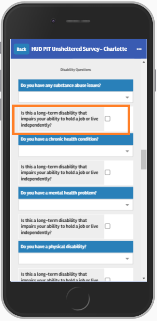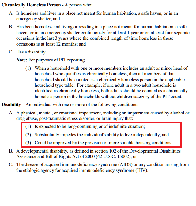 The questions that are part of the Point in Time survey template are structured so that the report logic calculates those people experiencing chronic homelessness. The 2019 HIC and PIT Data Collection Notice (Appendix B), clarifies the criteria based on duration of homelessness as well as disabling condition. In order to qualify as a disabling condition, some of the conditions must also meet the follow-up criteria that is highlighted below, and is represented in the survey with a check box.