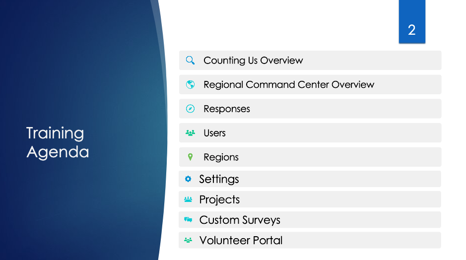 This YouTube playlist contains training videos for Count Administrators on how to use Counting Us and the Command Center to do everything from plan for the PIT Count, track responses in real time, to data clean up and reporting.