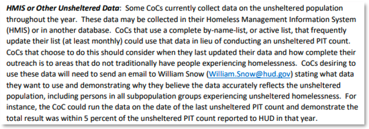 Outreach workers provide services and record interactions of people experiencing homelessness (PEH) using Show the Way. In doing so, the outreach staff are curating an active “by-name list” of those who are unsheltered in the CoC. With the aid of data integration, anyone on this active list can be removed from the PIT report if he/she was enrolled in a shelter or housing project in the COC for the night of the count. This data can further be refined with the aid of any volunteers who are willing and able to conduct surveys using Counting Us as part of the “traditional” point in time count activities. More details on this innovative approach to better connect with and support our unsheltered neighbors can be found in this short video: